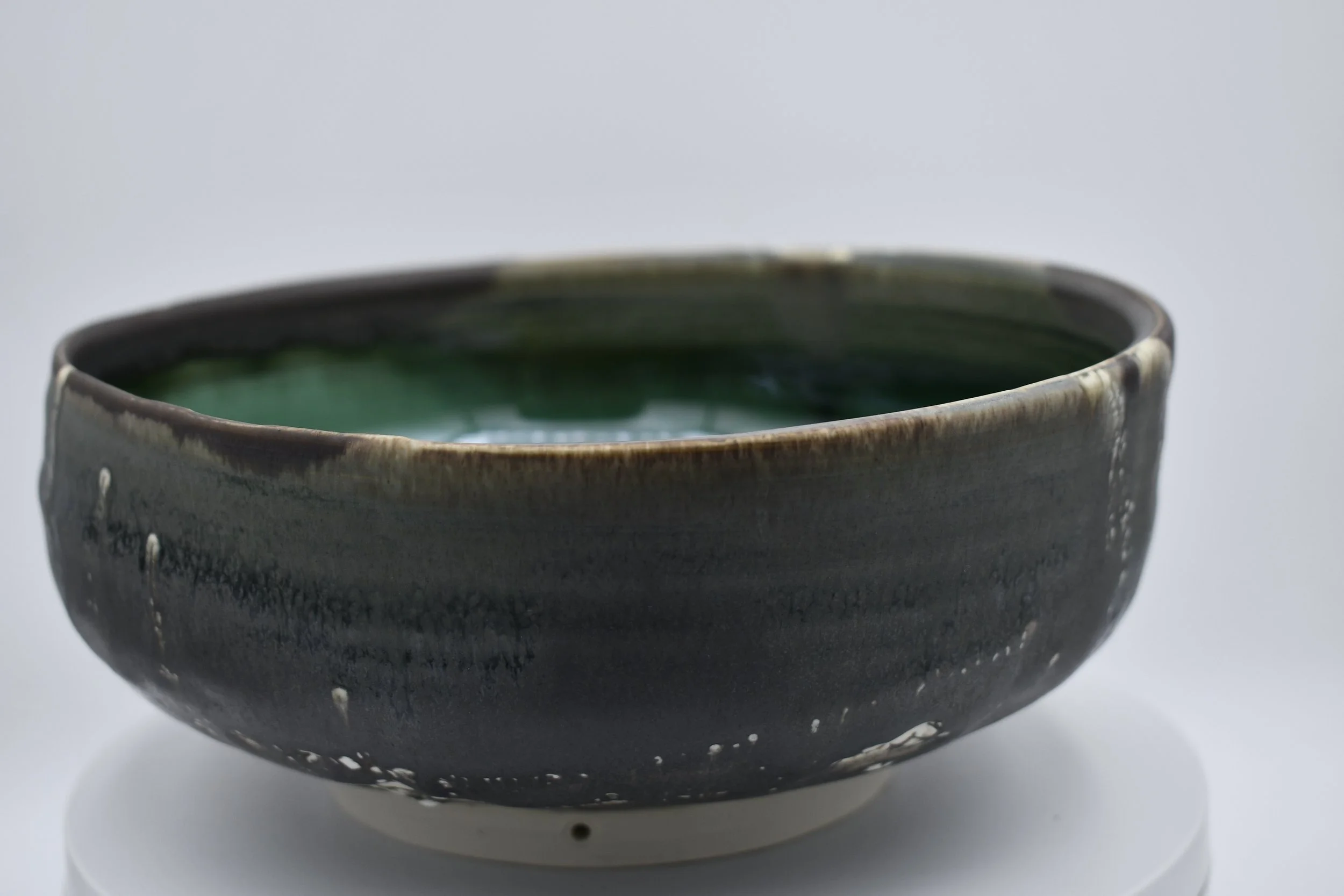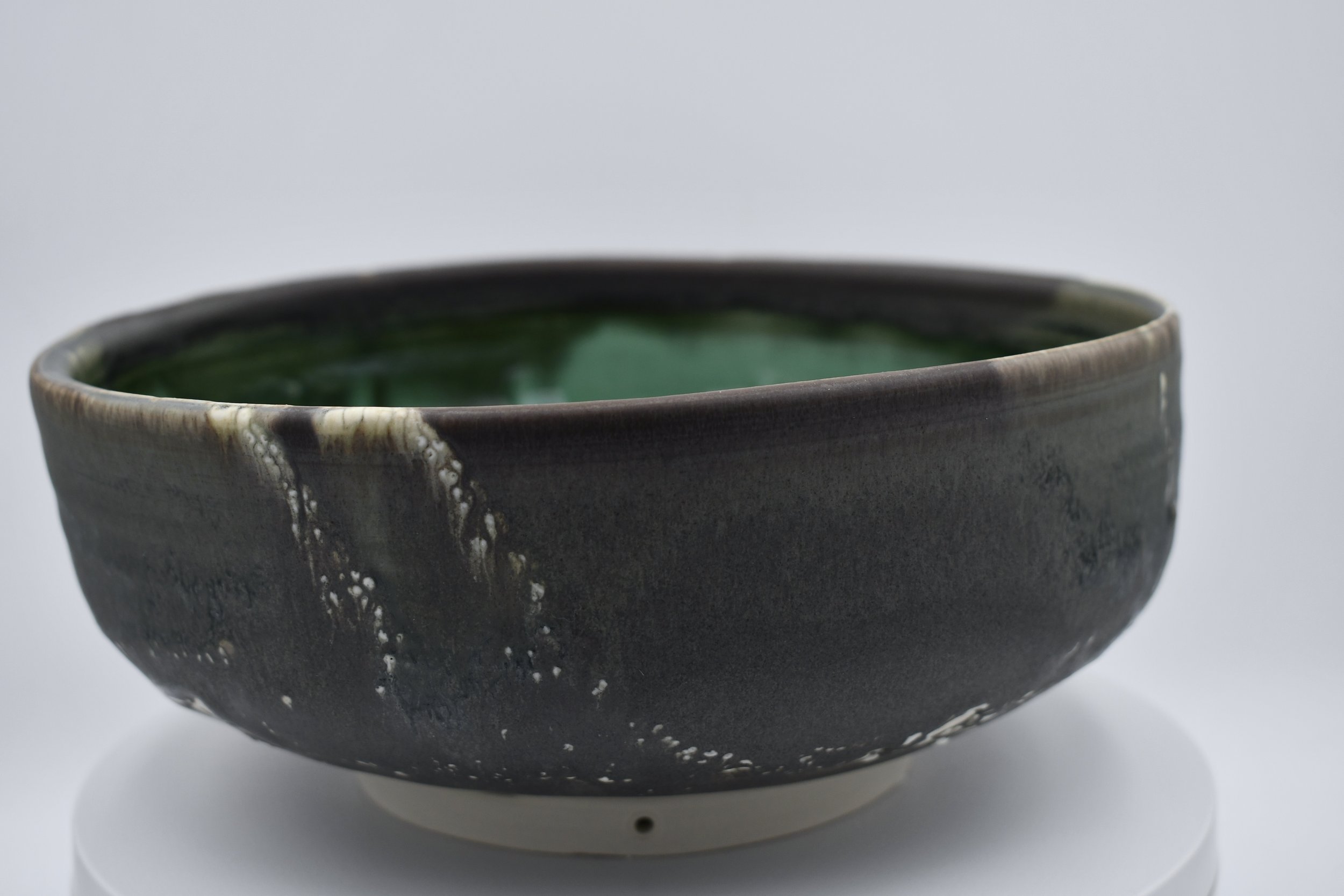This piece is features a new feature of small holes made in the foot-ring of the bowl. This allows for a wire to be strung through the bottom to mount the bowl on a vertical platform.